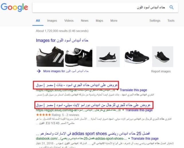في خضم الحديث عن مكونات استراتيجية تحسين محركات البحث ، يعتبر العنوان هو من أهم الأماكن لوضع الكلمة المفتاحية المستهدفة، حيث يظهر العنوان باللون الأزرق في نتائج البحث، وعند تضمين الكلمة المفتاحية في وسم العنوان، تعزز من قدرة جوجل على تصنيف المحتوى الخاص بك، فتأكد من أن العنوان واضح ودقيق، ويحتوي على الكلمة المفتاحية بشكل طبيعي، كما في المثال التالي: حذاء أديداس أسود اللون – تسوق الآن في YourStore